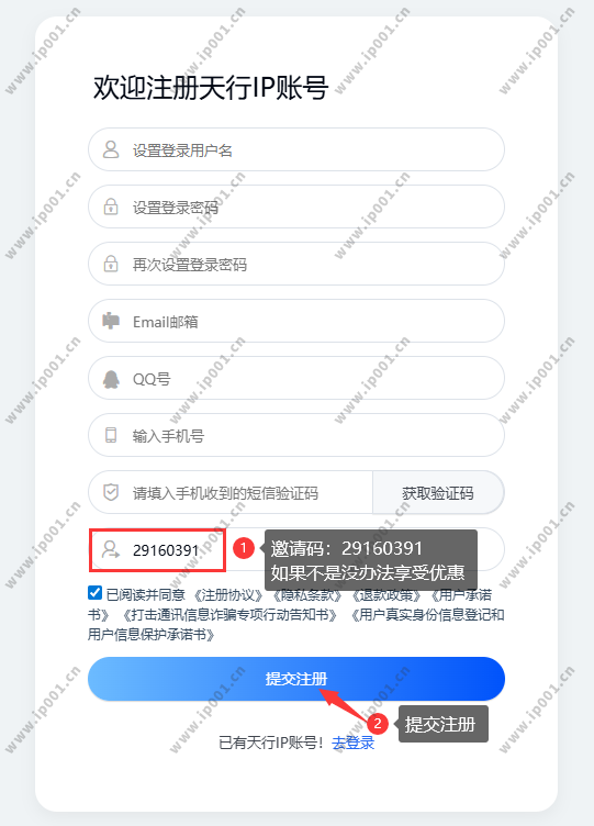 根据提示设置用户名、密码、邮箱、QQ号、手机号、验证码、邀请码 29160391 点击注册。
