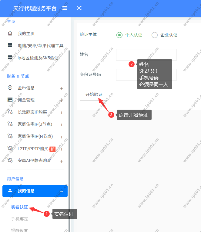 账号注册成功会自动跳转到用户后台,点击我的信息→实名认证,根据提示完成实名认证。 ⚠️ 重要提示:不完成实名认证无法购买任何节点产品