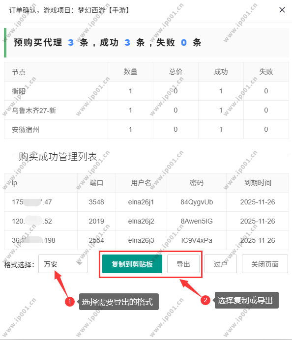 找到已购套餐 → 点击导入IP → 粘贴节点信息 → 点击匹配 → 勾选目标节点 → 选择续费/更换/改密等 → 完成操作。