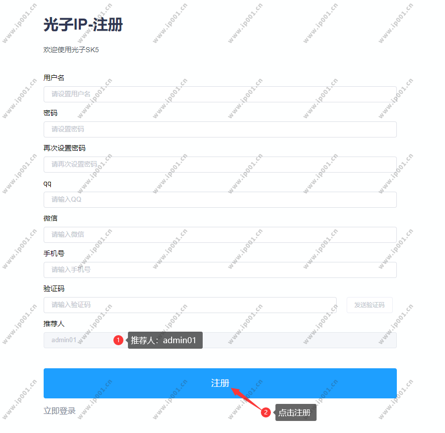根据要求设置用户名、密码、QQ号、微信号、手机号、验证码、邀请码 admin01 点击注册。