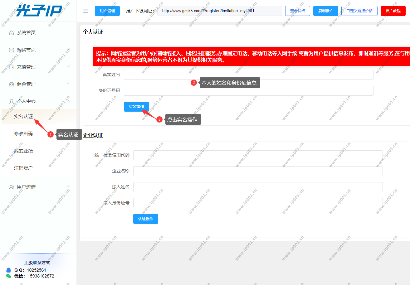账号注册成功后会提示您登录,输入刚注册的账号密码点击登录,点击个人中心→实名认证,根据要求完成实名操作。 ⚠️ 重要提示:不完成实名认证无法购买任何节点产品