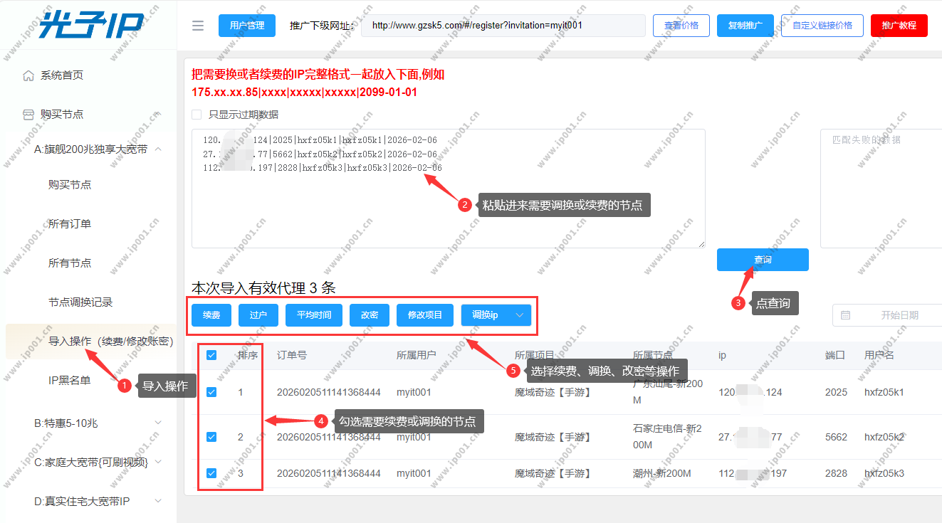 找到已购套餐 → 点击导入操作 → 粘贴节点信息 → 点击查询 → 勾选目标节点 → 选择续费/调换/改密等 → 完成操作。